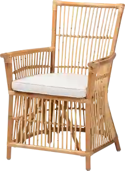 This chair features a natural rattan frame with intricate bamboo-like embellishments, capturing the relaxed, organic essence of bohemian and coastal design. Handcrafted in Indonesia, its curved arms and open-back silhouette provide an airy, light-filled aesthetic that perfectly complements natural wood finishes and the "natural" beige and white color palettes found in tranquil, modern spaces.