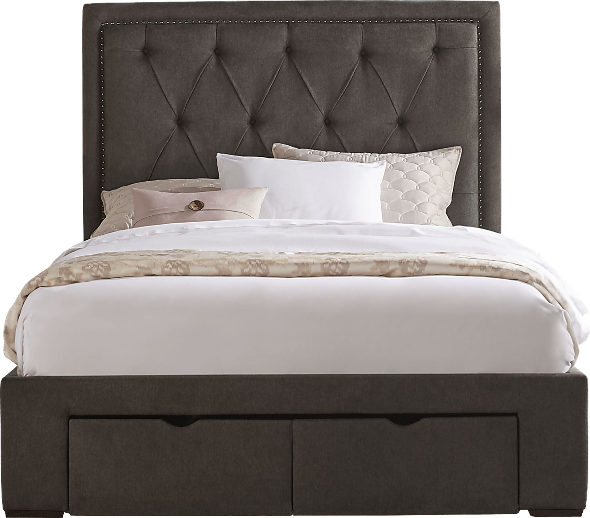 Add instant elegance to your existing decor with the Elridge bed. Exquisite diamond button tufting on the headboard combines with chic nailhead accents for a stunningly contemporary look. Soft granite upholstery is timelessly elegant. Two storage drawers are a great place for keeping extra linens or seasonal clothes. Mattress and foundation (if required) sold separately. Bed shown is queen size.