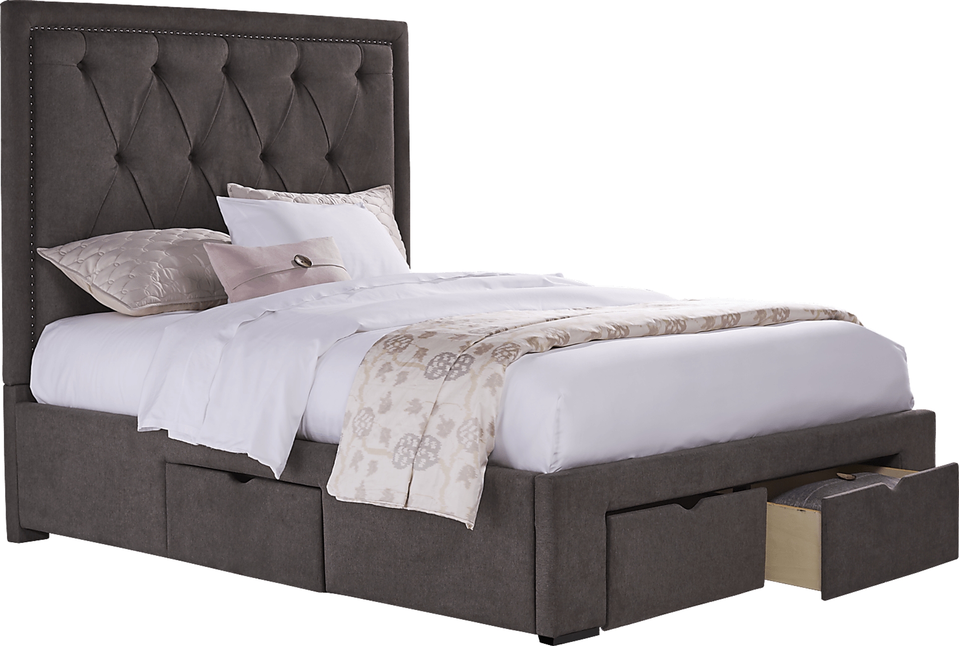 Add instant elegance to your existing decor with the Elridge bed. Exquisite diamond button tufting on the headboard combines with chic nailhead accents for a stunningly contemporary look. Soft granite upholstery is timelessly elegant. Four storage drawers are a great place for keeping extra linens or seasonal clothes. Mattress and foundation (if required) sold separately.