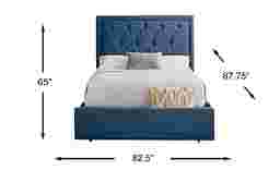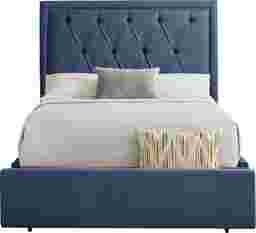 The quiet luxury that lingers like the afterglow of a glamorous night out emanates from the Elridge II collection as its luminous detailing shapes a space for elevated living. Fully upholstered in a rich blue fabric, this contemporary bed features a headboard with deep diamond tufting framed by a golden nailhead trim for a refined, modern edge. Clean lines and a low-profile silhouette keep the look fresh and sophisticated, while built-in storage at the footboard offers a convenient place to tuck away extra linens, pillows, or seasonal essentials. Mattress and foundation (if required) sold separately. Upholstery: 100% polyester.