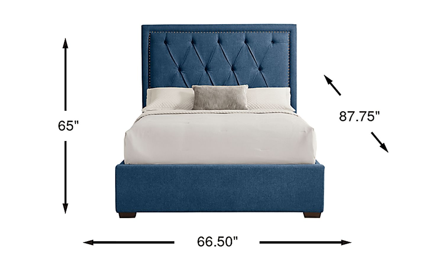 The luminous detailing and deep diamond tufting of this bed make it a centerpiece for contemporary and "new traditional" styles. The golden nailhead trim provides a refined, modern edge that pairs beautifully with metallic accents in nightstands or lighting fixtures. To complete the look, we suggest layering the rich blue fabric with neutral-toned bedding and textured pillows to emphasize the bed's elegant, multi-dimensional design.