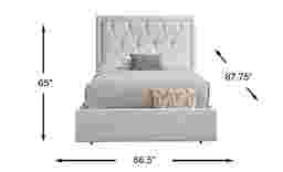 The quiet luxury that lingers like the afterglow of a glamorous night out emanates from the Elridge II collection as its luminous detailing shapes a space for elevated living. Fully upholstered in a soft gray fabric, this contemporary bed features a headboard with deep diamond tufting framed by a golden nailhead trim for a refined, modern edge. Clean lines and a low-profile silhouette keep the look fresh and sophisticated, while built-in storage at the footboard offers a convenient place to tuck away extra linens, pillows, or seasonal essentials. Mattress and foundation (if required) sold separately. Upholstery: 100% polyester.