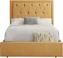 The quiet luxury that lingers like the afterglow of a glamorous night out emanates from the Elridge II collection as its luminous detailing shapes a space for elevated living. Fully upholstered in a rich yellow fabric, this contemporary bed features a headboard with deep diamond tufting framed by a golden nailhead trim for a refined, modern edge. Clean lines and a low-profile silhouette keep the look fresh and sophisticated, while built-in storage at the footboard offers a convenient place to tuck away extra linens, pillows, or seasonal essentials. Mattress and foundation (if required) sold separately. Upholstery: 100% polyester.