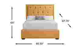With a headboard height of 65 inches, this bed is a dramatic statement piece that utilizes vertical space. While it occupies a standard queen footprint (66.5"w x 87.75"d), its low-profile silhouette helps maintain an open feel at floor level. For smaller rooms, we recommend verifying your ceiling height to ensure the tall headboard has enough clearance to serve as a focal point without overwhelming the space.