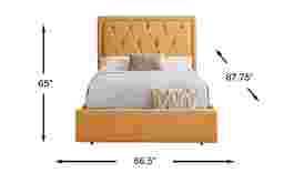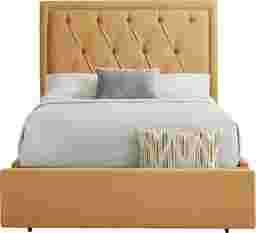 The quiet luxury that lingers like the afterglow of a glamorous night out emanates from the Elridge II collection as its luminous detailing shapes a space for elevated living. Fully upholstered in a rich yellow fabric, this contemporary bed features a headboard with deep diamond tufting framed by a golden nailhead trim for a refined, modern edge. Clean lines and a low-profile silhouette keep the look fresh and sophisticated, while built-in storage at the footboard offers a convenient place to tuck away extra linens, pillows, or seasonal essentials. Mattress and foundation (if required) sold separately. Upholstery: 100% polyester.