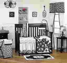 Say hello to Hollywood glamour with the Elsa four piece crib set. Inclusive of a quilt, dust ruffle, and two soft 100% cotton printed sheets, the all black and white set creates a beautiful, classic and highly stylized minimalist color story with lots of sophistication for baby's nursery. The stunning prints and embroidered embellishments are great for both boys and girls. Elsa 4 Pc Crib Set Quilt, dust ruffle - 65% Poly/35% Cotton, crib sheets - 100% Cotton Crib not included.