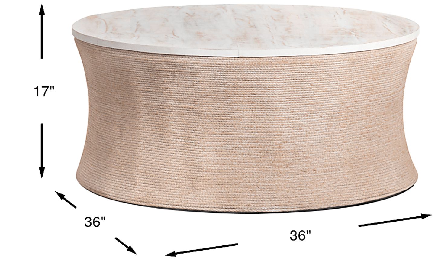 Earthy texture meets sculptural form in the organic beauty and bold craftsmanship of the Elysium cocktail table. Featuring a gently flared iron base wrapped in hand-applied natural jute, this piece's silhouette is shaped with elegant details and artisanal texture. A true statement in transitional style, the warm, woven base contrasts beautifully with a smooth top finished in a natural tone, bringing rich character to coastal, bohemian or modern organic interiors.