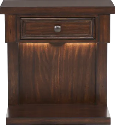 This nightstand features a versatile "transitional" design that effortlessly balances a traditional silhouette with modern polish. The dark brown stain and sleek metallic hardware make it a sophisticated anchor for contemporary bedrooms, yet its classic proportions and rich wood texture allow it to feel equally at home in more traditional or rustic-leaning decors.