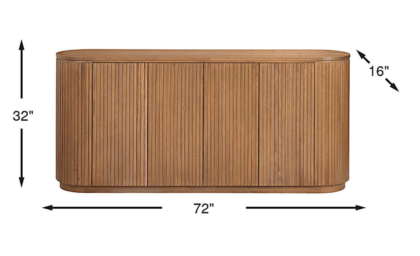 Dining linens, serve ware, barware, media accessories and more, the Emery credenza offers a discreet trove for the home treasures you don't necessarily need to display. With its rounded silhouette and vertical slat-front design, this piece is highlighted by a rich brown finish that lends natural warmth and textural sophistication to a myriad of spaces. Inside, adjustable shelving provides flexible storage, making it easy to tailor the interior to your needs. The back of the piece includes holes for wires to seamlessly pass through to power and electricity. The broad surface is even perfect for staging lamps, curated art or a buffet for gatherings, inviting you to reimagine the possibilities of entertaining and decorating.