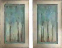 The modern Enchanted Night set of 2 oil reproduction landscapes features a hand applied, dabbed finish with muted shades of blue, green, and beige create abstract detailing. This piece has large, silver leaf frames with a heavy champagne wash which have slightly distressed edges that are accented in a warm sepia tone. A muted, aqua inner lip with a heavy charcoal glaze completes this set of artwork.