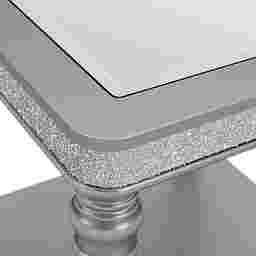 To maintain the brilliant shine of the mirrored top, we recommend using a standard ammonia-free glass cleaner applied to a microfiber cloth rather than sprayed directly onto the surface. For the silver-finished metal frame and glitter trim, a dry or slightly damp soft cloth is best for removing dust. Avoid abrasive chemicals or scouring pads, which can mar the reflective finish.