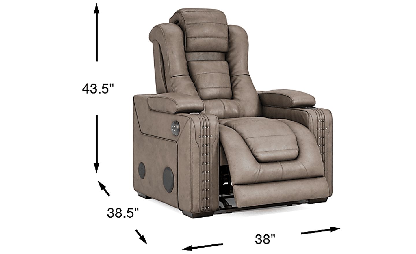 Let the Chief dual power recliner be your headquarters for relaxing evenings and weekends. This premium seating choice, has it all. Upholstered in a textured fabric with the rich look of brown taupe, it features dual power reclining mechanisms that independently raise and lower the headrest and padded chaise footrest with the touch of a button. The thick padded seat and back feature deep channeling and "no-sag" sinuous springs. Each arm, including the one on the right side with a cup holder, has a padded armrest that lifts to uncover a storage compartment. The front of each arm has cool stitching detail and small nail accents that mimic the neck of a guitar. 100% Polyester.