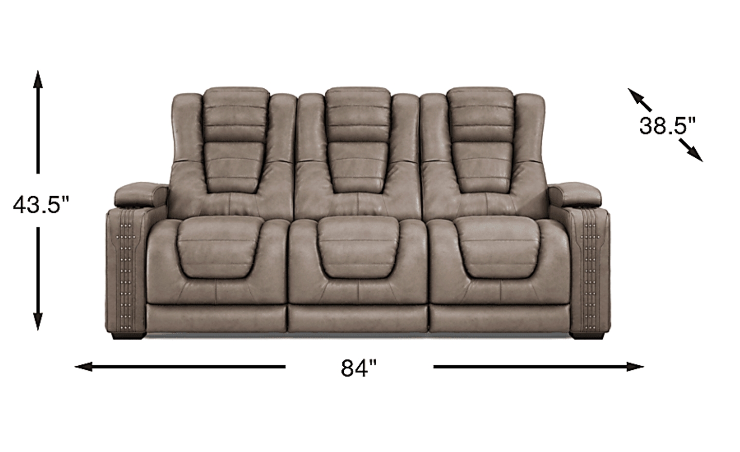 Nashville meets Memphis in the irresistible country flair of the Chief sofa. This piece brings together rustic yet contemporary styling that creates cozy comfort for family and friends. The home theater style sofa, with thick padded seats and backs with deep channeling and "no-sag" sinuous springs, is upholstered in a textured fabric for a rich taupe leather-like look. Premium features include independently operated power reclining functions that raise and lower two of the headrests and both padded chaise footrests with the touch of a button. The center cushion folds down to reveal a table-style surface, twin cup holders, two wireless charging pads and a magazine storage pouch. Each arm has a cup holder and padded armrest that conceals a storage compartment. The arms are finished with cool stitching detail and small nail accents that look like the neck of a guitar, strings and frets. 100% Polyester.