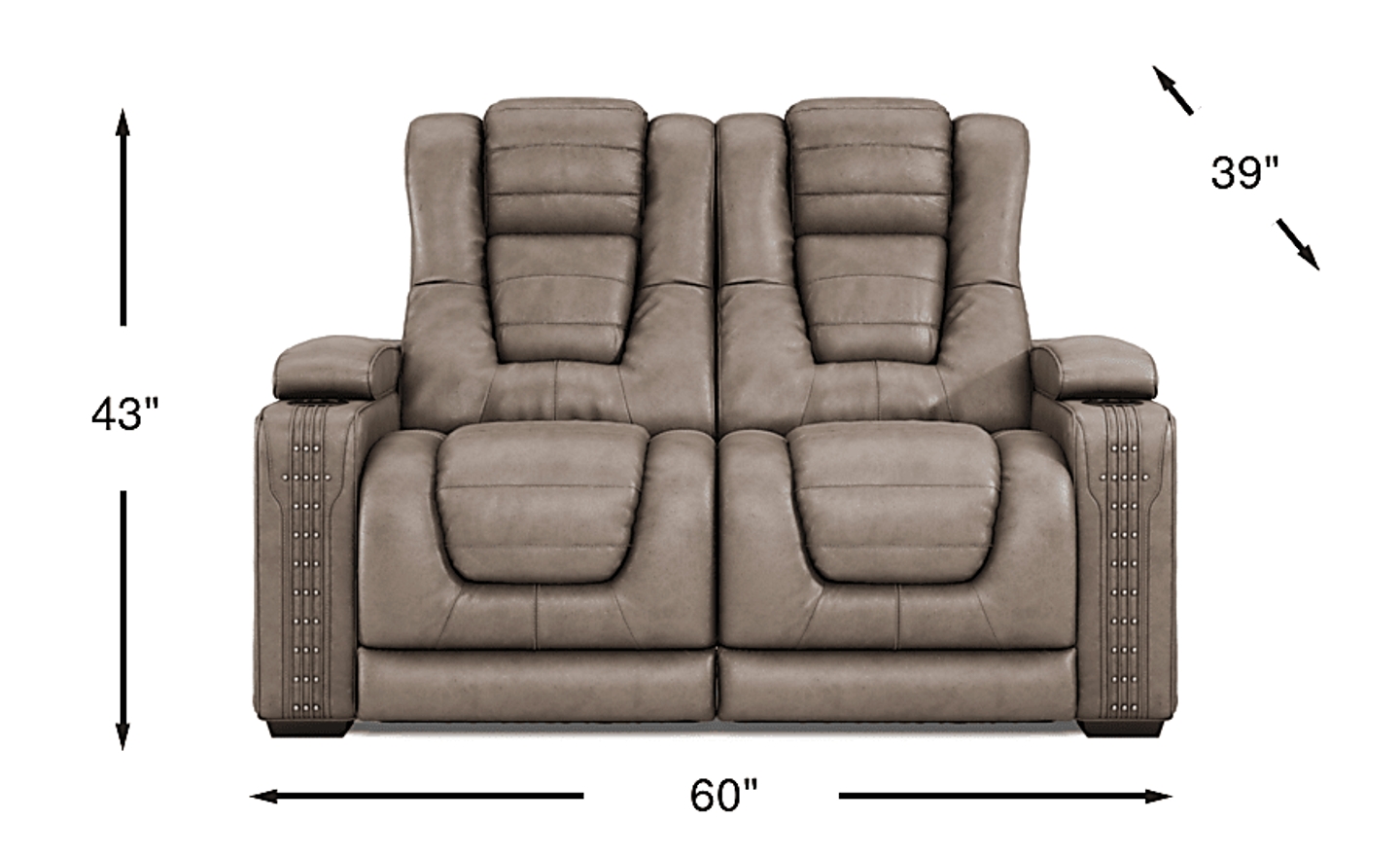 Nashville meets Memphis in the irresistible country flair of the Chief loveseat. This exceptional piece offers cozy comfort for two. Upholstered in a textured fabric, the loveseat has the rich look of taupe leather. This cozy spot also features thick padded seats and backs with deep channeling and "no-sag" sinuous springs. A cup holder on each arm keeps beverages close by while a compartment under each padded armrest provides storage for remotes, game controllers and more. The arms are finished with cool stitching detail and small nail accents that create the look of a guitar's strings and frets. 100% Polyester.