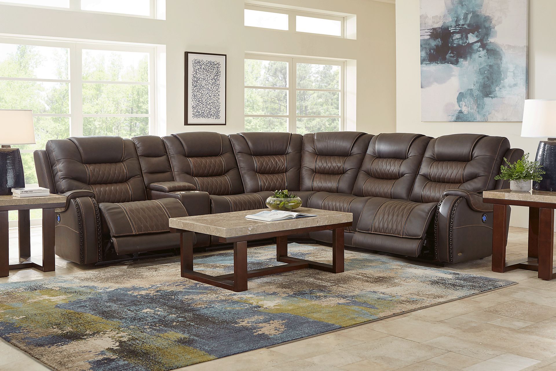 Created to fit your lifestyle and make the most of your family time, the Headliner sectional is all about relaxation, comfort and convenience. This contemporary sectional is packed with premium features and upholstered in rich brown top grain leather where the body touches. Recliners on each end of the sectional boast USB ports and head-to-toe dual power customized comfort provided by touch-of-a button power adjustable headrests and power reclining chaise style footrests. Additional seating includes a stationary chair and standard recliner. A console with lift-top storage features two cupholders. Stylish too, the sectional has contrasting stitching detail, nailhead accents and diamond stitched seating insets. Combined, these ingredients create the perfect headquarters for watching the big game and more. 23" extension when footrest is fully reclined. Allow 6" for wall spacing. Upholstery: Top grain leather where the body touches and polyurethane fabric sides and backs.