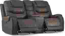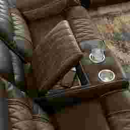 Made for the way you live your life, the Headliner reclining loveseat from Eric Church is all about relaxing in style. This seating duet is packed with features and upholstered in rich brown top grain leather where the body touches. Providing full leg and foot support, the chaise-style footrests are perfect for napping or watching TV. A console with lift-top storage features two cupholders. Contrast stitching detail, nailhead accents and diamond-stitched seating insets add high quality touches you'll appreciate. Top grain leather where the body touches and polyurethane fabric sides and backs.