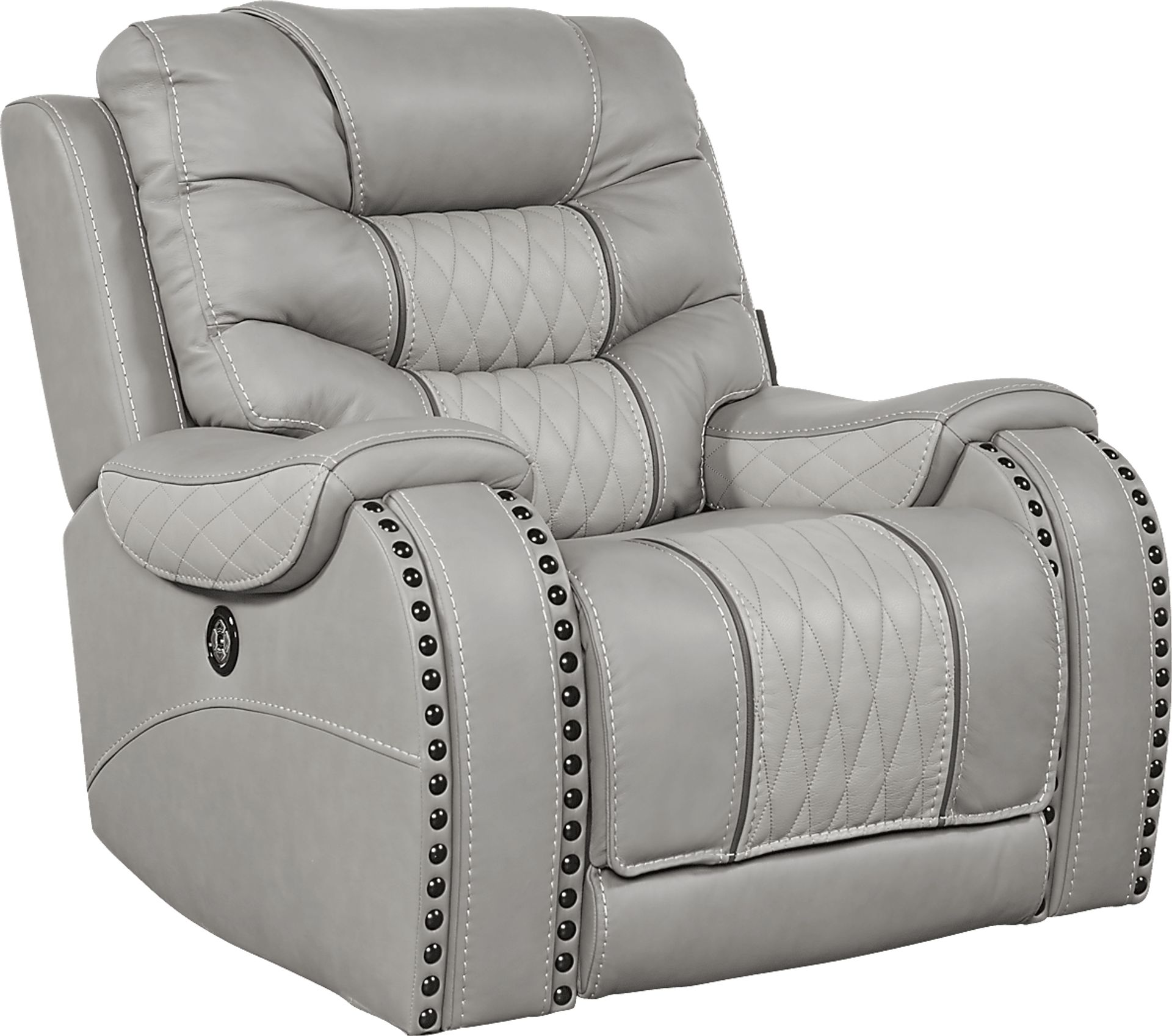 Made for your comfort, the Headliner dual power recliner takes relaxation to the next level. Packed with features this stylish seating from the Eric Church collection is upholstered in gray top grain leather where the body touches. The dual power headrest and padover chaise footrest can be raised and lowered at the touch of a button to create your perfect position. A handy USB port keeps mobile devices charged. Top Grain Leather Where the Body Touches and Polyurethane Fabric sides and backs.