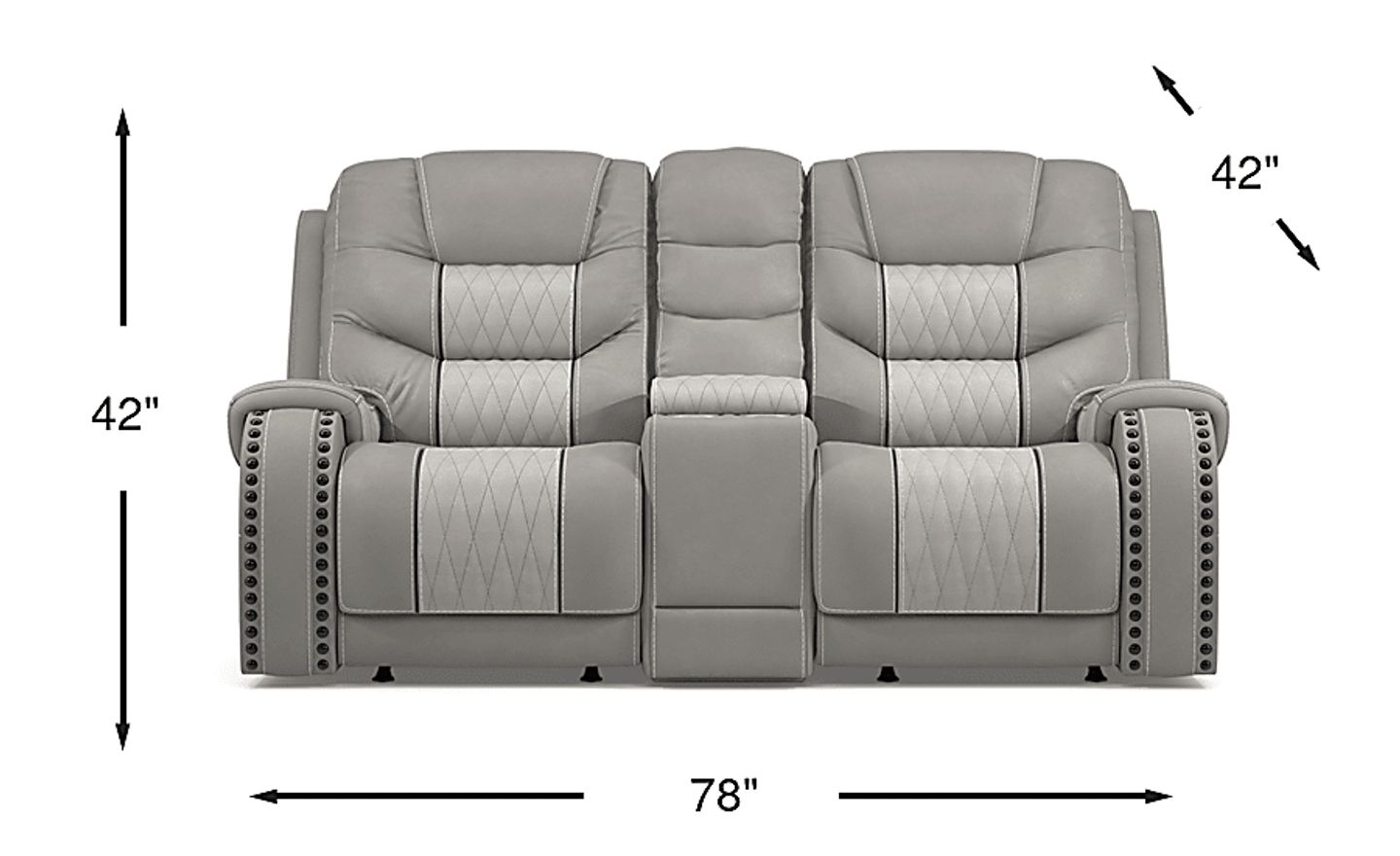 Made for the way you live your life, the Headliner dual power reclining loveseat from Eric Church is all about relaxing in style with premium amenities. The loveseat is packed with features and upholstered in gray top grain leather where the body touches. With the push of a button the dual power headrests and chaise-style footrests raise and lower to any position for customized head-to-toe comfort. A convenient USB port on the side of each recliner keeps phones and tablets charged. A console with lift-top storage features twin cupholders. Contrasting stitching detail, nailhead accents and diamond stitched seating insets add high quality touches you'll appreciate. Top Grain Leather Where the Body Touches and Polyurethane Fabric sides and backs.
