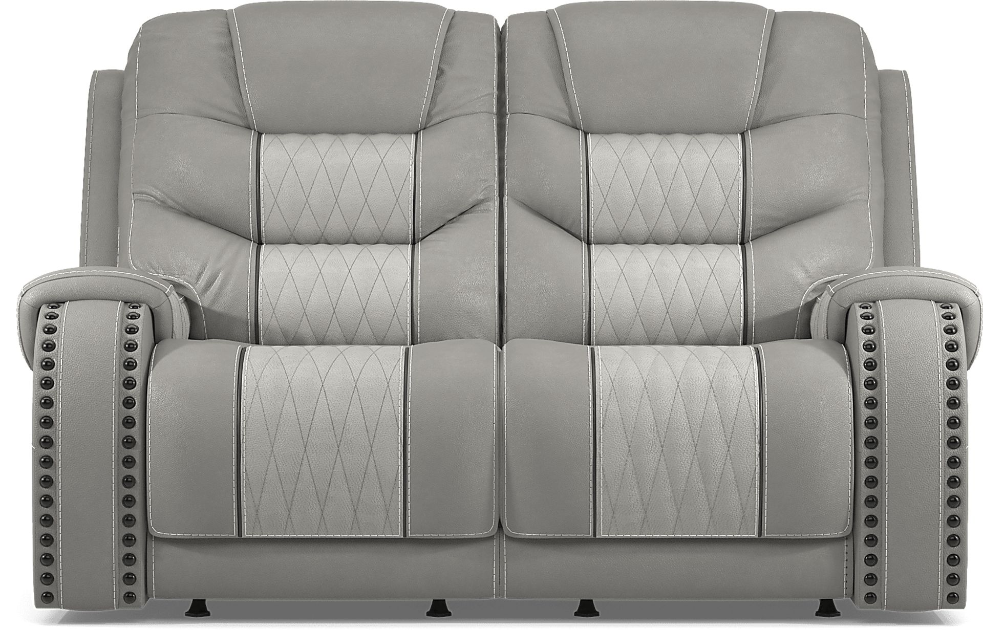The Headliner loveseat offers the perfect seating duet. It has a rustic contemporary vibe that's all about relaxing with family and friends. Upholstered in gray top grain leather where the body touches, the loveseat features contrasting stitching detail, nailhead accents and diamond stitched seating insets. Top Grain Leather Where the Body Touches and Polyurethane Fabric sides and backs.