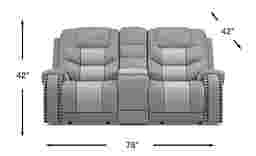 Made for the way you live your life, the Headliner reclining loveseat from Eric Church is all about relaxing in style. This seating duet is packed with features and upholstered in gray top grain leather where the body touches. Providing full leg and foot support, the chaise-style footrests are perfect for napping or watching TV. A console with lift-top storage features two cupholders. Contrast stitching detail, nailhead accents and diamond-stitched seating insets add high quality touches you'll appreciate. Top grain leather where the body touches and polyurethane fabric sides and backs.