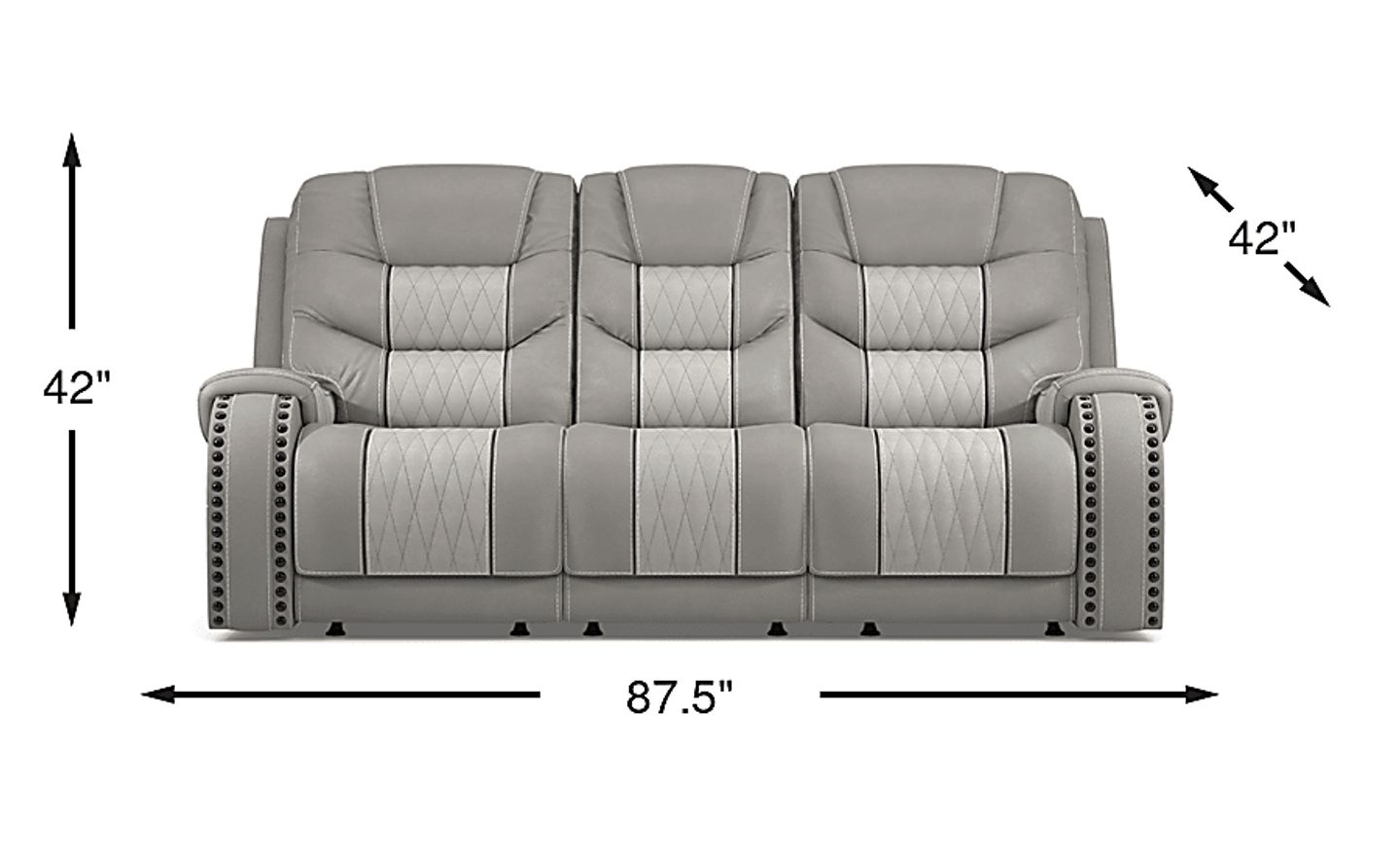 Country music finds a home with the warm, rustic design of the Headliner reclining sofa. Inspired by the eclectic music and lifestyle of Eric Church, the sofa is upholstered in gray top grain leather where the body touches. Stylish diamond stitching insets, nailhead accents and contrasting stitching detail add quality touches while the padover chaise style footrests provide full leg and foot support for napping or watching TV. 23" extension when footrest is fully reclined. Allow 6" for wall spacing. Top Grain Leather Where the Body Touches and Polyurethane Fabric sides and backs.