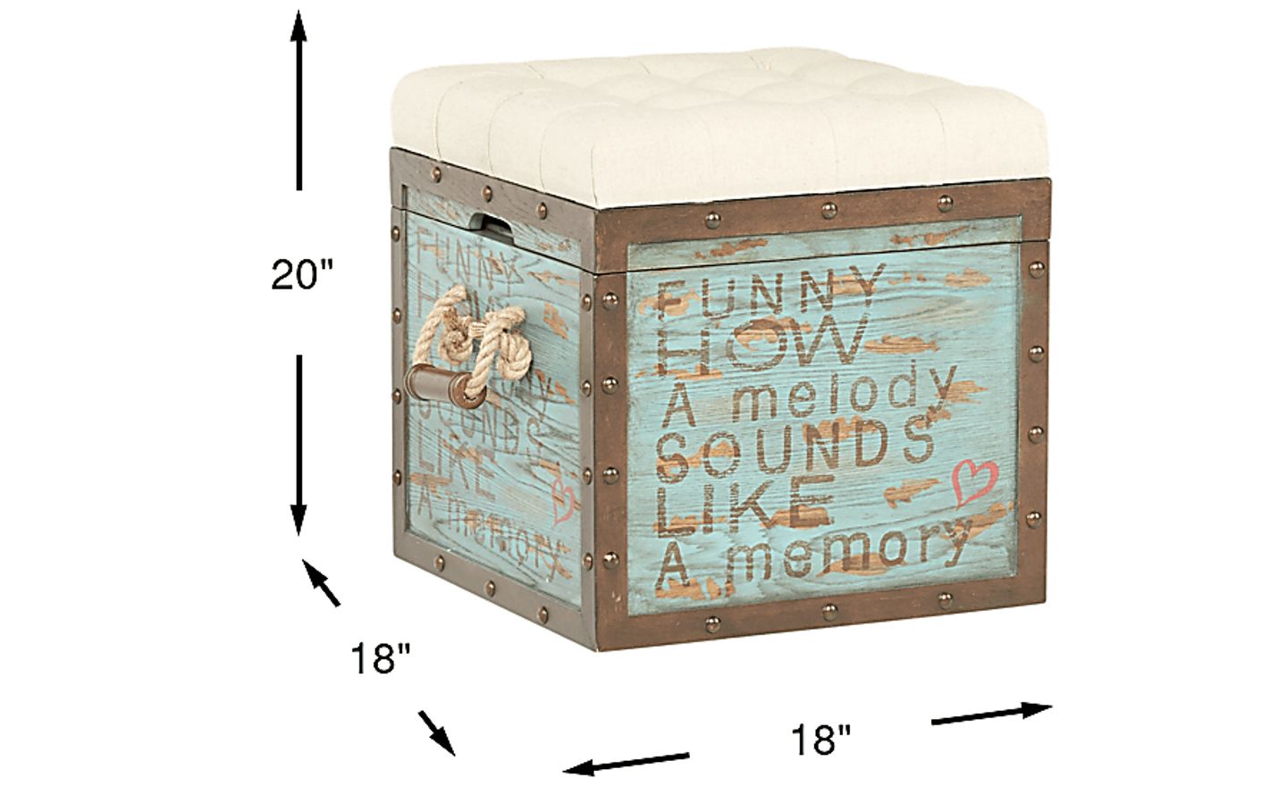 Edgy yet versatile, the Heartland Falls ottoman is a piece with attitude. Inspired by the music and lifestyle of Eric Church, it has the rustic look of a re-purposed vintage crate, complete with nailhead accents and rope handles. Made with wood solids and oak veneers, it features lyrics from his song Springsteen: "Funny how a melody sounds like a memory." The distressed blue finish complements the entire Highway to Home collection, yet also looks great as a standalone piece. Topped with a removable cream-colored cushion, this ottoman easily becomes an impromptu seat for an extra guest, and can also be used as a footrest. Hidden under the padded cushion, you'll even find a place to store small trinkets, books, or other odds and ends.