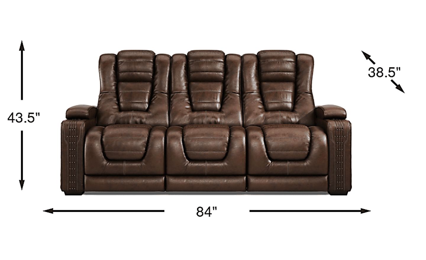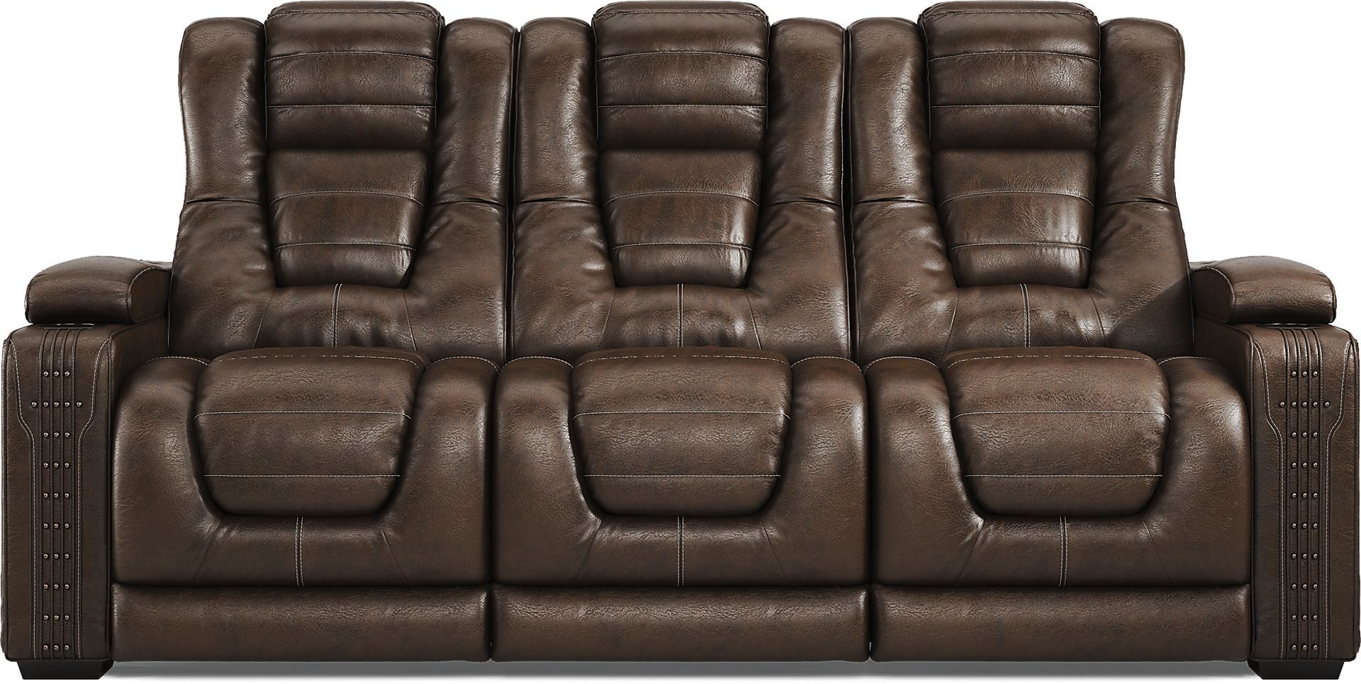 Feel like Nashville royalty with the country flair of the Renegade sofa. This piece brings together rustic yet contemporary styling that creates cozy comfort for family and friends. The home theater style sofa, with thick padded seats and backs with deep channeling and "no-sag" sinuous springs, is upholstered in supple top grain leather rendered in a rich brown color. Premium features include independently operated dual power reclining functions that raise and lower two of the headrests and both padded chaise footrests with the touch of a button. The center cushion folds down to reveal a table-style surface, twin cup holders, two wireless charging pads and a magazine storage pouch. Each arm has a cup holder and padded armrest that conceals a storage compartment. The arms are finished with cool stitching detail and small nail accents that look like the neck of a guitar, strings and frets. Top Grain Leather Where the Body Touches and Vinyl Sides and Backs.