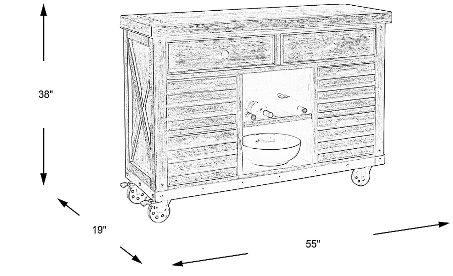 Store all your dining necessities in rustic style with the Tap Room server. This storage friendly piece features six roomy drawers, notches for up to four wine bottles and an open storage area. Each drawer is made with French and English dovetail joints for strength and stability. Rivets on black metal trim and working metal wheels amp up the urban industrial feel while X shaped accents on each side play up the rustic look.