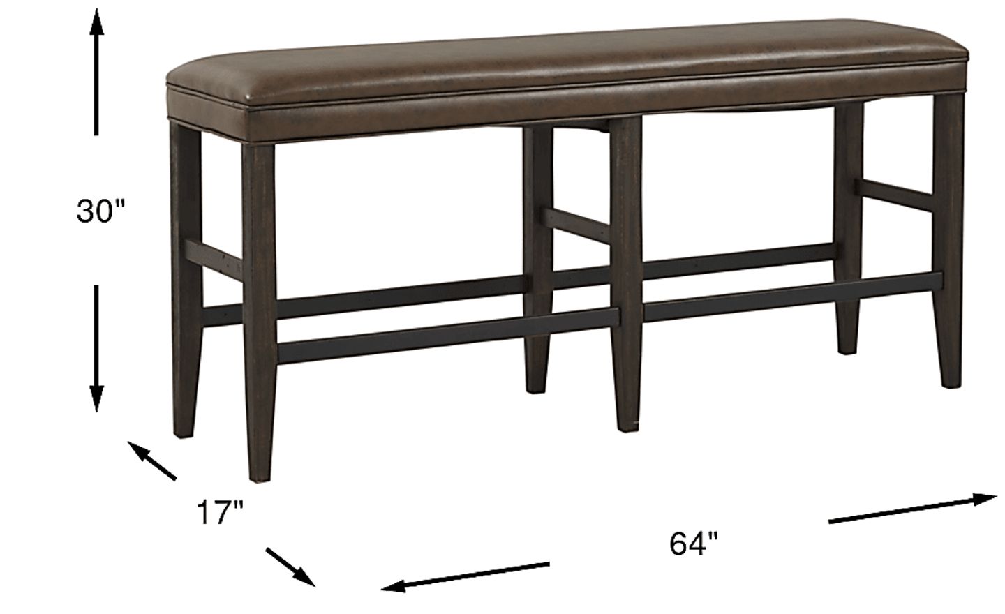 Create a rustic bar vibe with the Tap Room bar height bench. This long bench provides comfortable seating for 2- 3 people. The dark brown upholstery has a leather look enhanced by a base of wood solids in a rich brown finish.