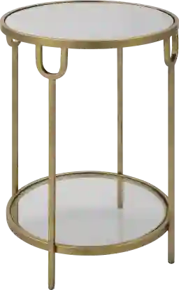 This round, two-tiered Eriska side table made of iron, features a mirrored top and tempered glass on bottom. Finished in an antique gold, this table will be perfect with almost any decor. Customer assembly is required.