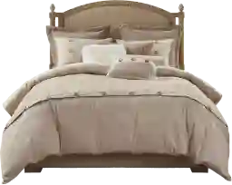 Elevate your bedroom with luxurious style of the Erixa comforter set. This oversized jacquard comforter features 2 geometric patterns, in taupe and ivory, pieced together with decorative button accents, for a glamorous look. An overfilled removable insert, secured by inner ties and a button closure, eliminates visible bar tacking lines from the top of the bed, for a clean duvet-style aesthetic. Also included are 2 shams and 2 Euro shams that gorgeously pair with the comforter, while 2 square decorative pillows and 1 oblong decorative pillow provide the finishing touches to complete this luxury bedding set. Each decorative pillow features a removable cover with a hidden zipper closure and has either an ottoman weave, faux fur, or pieced design. Comforter Cover dry clean only. Comforter Insert machine washable. Customer assembly is required.