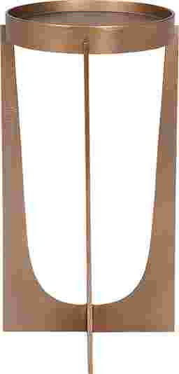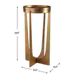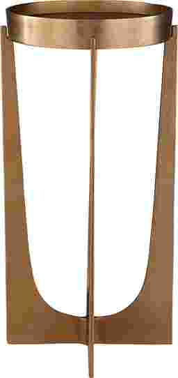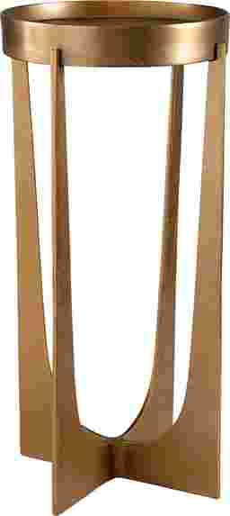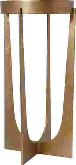 Crafted from durable cast aluminum, this Erohn accent table is finished in old brass antique and combines elegance with practicality. The round tray top is nestled on four legs that converge beautifully at the bottom, creating a unique and eye-catching silhouette. Customer assembly required.