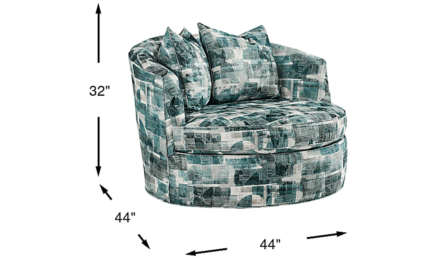 Turning everyday moments into quiet, restorative breaks from the hustle and bustle, the Essex Lane collection from Cindy Crawford Home carves out an intimate, tranquil space with each sumptuous piece. Transitional in style, this swivel chair showcases soft velvet upholstery with a blue and ivory motif, offering a bold accent piece for your space. cushioned barrel arms add a touch of sophistication while providing cradling comfort. The seat cushion features a plush custom blend of feathers, fiber and down surrounding a supportive foam core for comfort that’s soft yet structured. Cloud-like deep seating and loose scatter-back pillows invite you to unwind in indulgent relaxation and style. Upholstery: 96% polyester, 4% viscose.