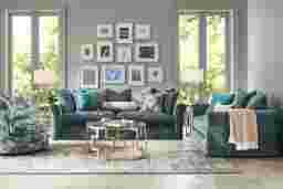 Turning everyday moments into quiet, restorative breaks from the hustle and bustle, the Essex Lane collection from Cindy Crawford Home carves out an intimate, tranquil space with each sumptuous piece. Transitional in style, this living room showcases plush chenille slipcovers in a blue lagoon hue, offering a timeless, welcoming aesthetic. cushioned roll arms add a touch of sophistication while gently embracing in comfort. The seat cushions feature a plush custom blend of feathers, fiber and down surrounding a supportive foam core for comfort that’s soft yet structured. Cloud-like deep seating and loose scatter-back pillows invite you to unwind in indulgent relaxation and style. Upholstery: 85% polyester, 15% rayon. Cleaning Instructions: Use water-based cleaning agents or foam.