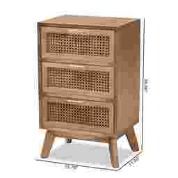 The stunning, retro-inspired design of the Ethelwyn brown nightstand elevates the capabilities of your nighttime routine. This remarkable piece is crafted from sturdy wood and adorned with woven rattan drawer faces. Three drawers provide ample storage space for your nightly needs and reserve the tabletop for daily use. The Ethelwyn brown nightstand utilizes sleek, angled legs for stable support that lends classic charm. A fantastic solution for lively homes, the Ethelwyn develops the modern bedroom. Customer assembly is required.