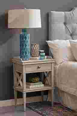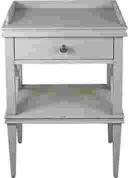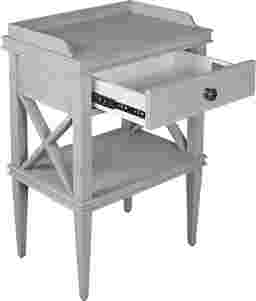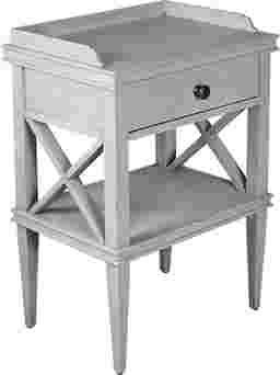 Perfectly proportioned, this stylish accent table works beautifully beside any chair or sofa. It wears a pale gray finish and features a storage drawer with brushed nickel pull. Design elements such as tapered legs, an open display shelf, x-shaped sides, and a raised gallery rail render this table unforgettable.