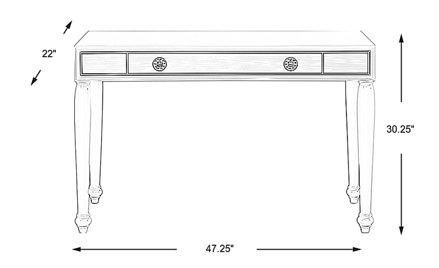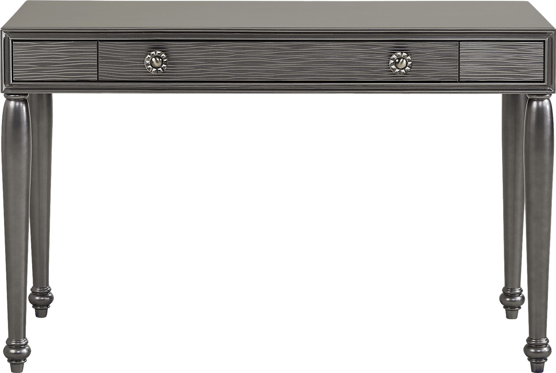 Fashioned with a glamourous, antique-inspired look, the gorgeous Evangeline desk brings timeless and elegant style to your loved one's space. Crafted with wood solids in a shimmering charcoal finish, this desk features a spacious center drawer with plenty of space to store school supplies, makeup and more. Stunning wavy details on the front highlight the oversized round knob pulls with acrylic crystal embellishments for a glimmering final touch.
