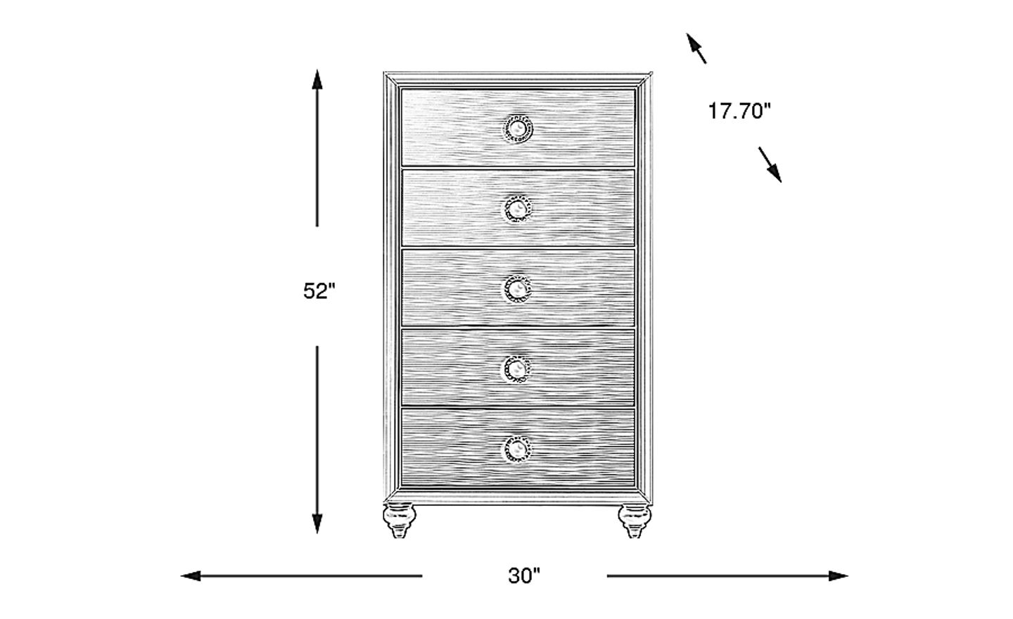 Elegant, metallic design features and inlaid molded accents in the Evangeline chest create a glamorous, chic environment. Featuring five drawers with embellished knobs and dustproof bottoms, each is crafted with English dovetail joints and kenlin metal center glides to ensure reinforcement and longevity.