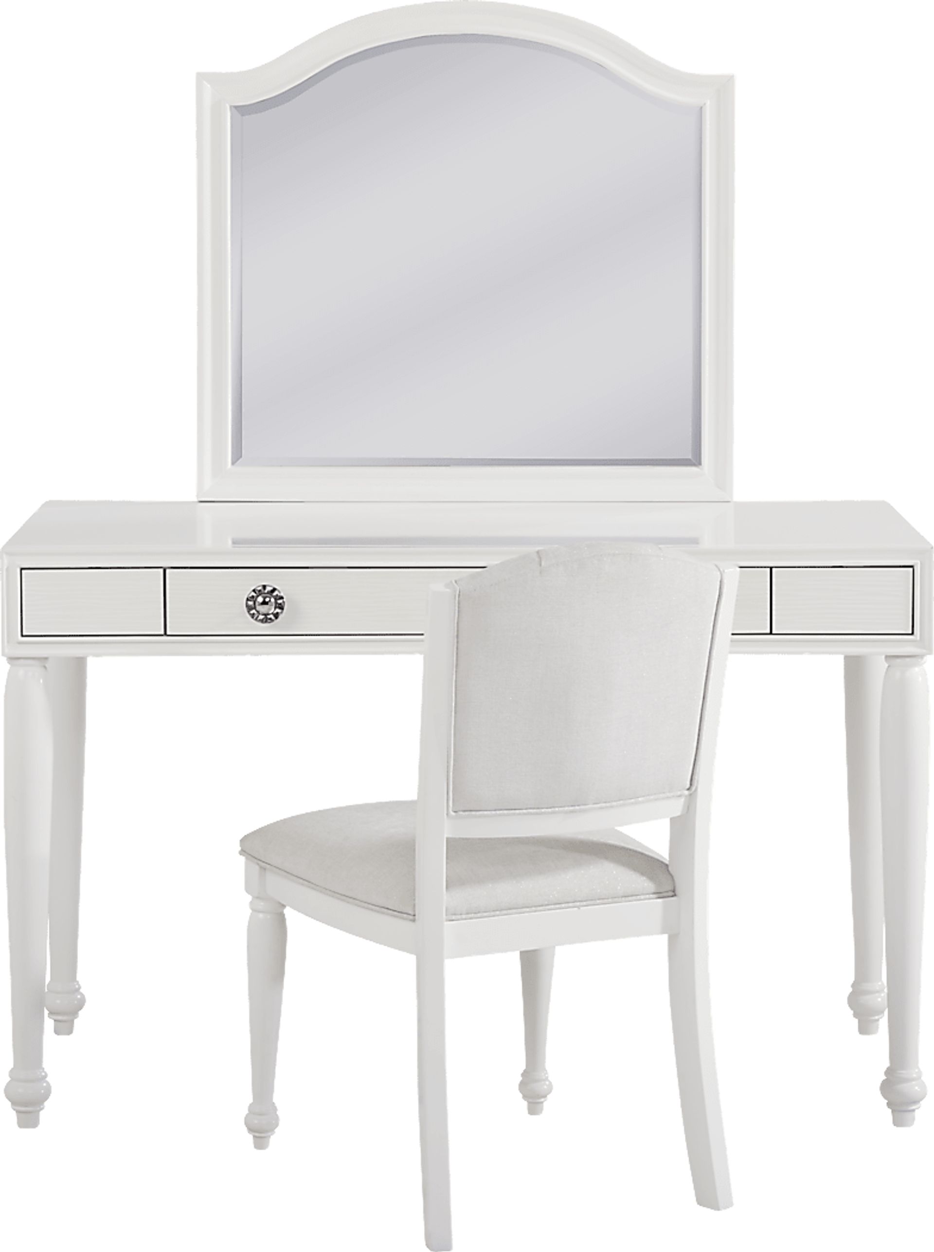 Fashioned with a glamourous, antique-inspired look, the gorgeous Evangeline vanity desk set brings timeless and elegant style to your loved one's space. Crafted with wood solids in a white finish, this desk is accented by stunning wavy details and oversized round knobs surrounded by acrylic crystal embellishments. The spacious center drawer provides ample space to store school supplies, makeup and more. Supple upholstery on the coordinating chair offers a seat as perfect for studying as it is for primping. The vanity mirror features beveled glass for an opulent final touch.