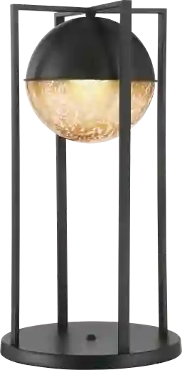 Featuring an elegant open-frame geometric design, this lamp is a natural fit for contemporary, modern, or transitional interiors. The contrast between the stark black metal finish and the luxurious gold crackled glass globe creates a sophisticated "conversation piece" that complements clean lines and metallic accents. It works particularly well as a statement item on a console table or as a paired set for a symmetrical bedroom look.