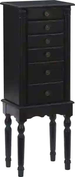 Measuring 13.5"W x 9.5"D x 37"H, this armoire is designed with specialized compartments to house an entire jewelry collection. It features multiple drawers of various sizes to organize rings, earrings, and watches, while the side doors open to reveal 10 hooks specifically intended to keep long necklaces untangled and accessible. This vertical configuration allows you to consolidate your valuables into one organized hub without a large footprint.
