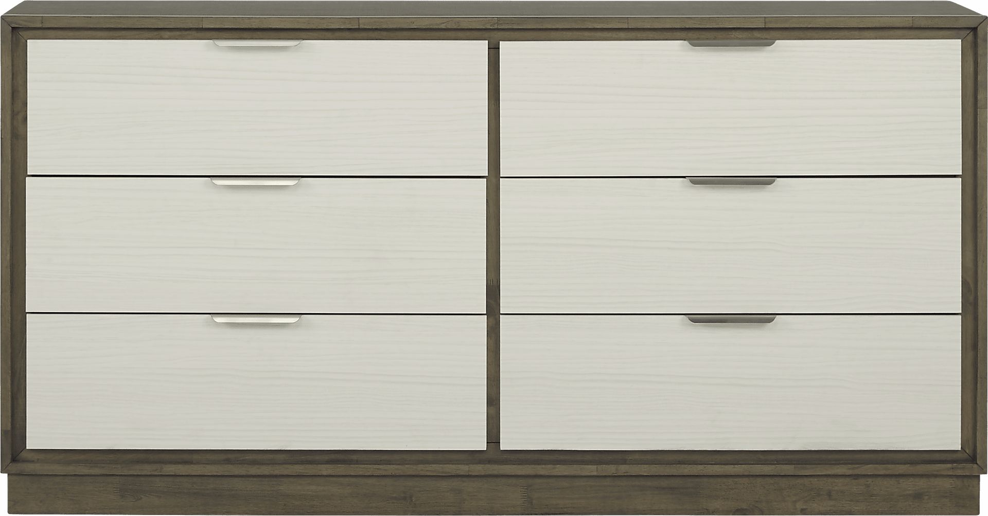 The Everson dresser is the perfect blend of good looks and storage for your bedroom. This piece is designed in a sleek contemporary style crafted with wood solids with a gray and white finish and metal hardware. Six drawers crafted with durable English dovetail fronts and backs ensures you will have plenty of space for your clothing.
