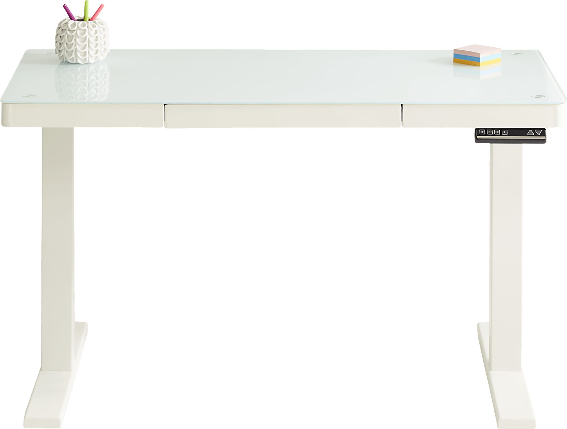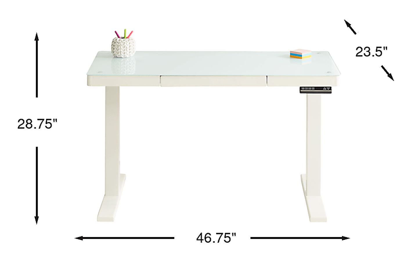Studying comes easy with the Exeter Place Adjustable Desk. Perfect for all ages, this piece makes a wonderful addition to any room whether its for homework or decor. Conveniently located beside the control panel is a USB port for power within reach. Sleek and tucked away is a drawer for concealed storage. Great for sitting and standing, this desk reaches the minimum height of 27 inches and maximum height of 42 inches. Coated in a classic white finish, this desk pairs well with any room.