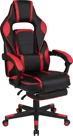Sit back, take a deep breath and get ready to have your mind blown when you take a ride in this thickly padded, reclining gaming chair with massager. This cool looking game chair has a striking contrast of black and red upholstery to look awesome in your decor. The removable lumbar pillow will not only support your lower back, it will also massage those tense muscles when you plug in the attached 3 ft. USB cord so you can keep that marathon gaming session going without cramping up. When you need a breather from the action, recline this high back chair 95 ~ 175 and surprise! Reclining chairs cradle your body in a comfortable position while relieving pressure from your back from sitting upright. The arms actually recline along with the back to keep you comfortable. Pull the loop to slide out the footrest, flip it up and take a quick power nap to recharge your batteries. Customer assembly is required.