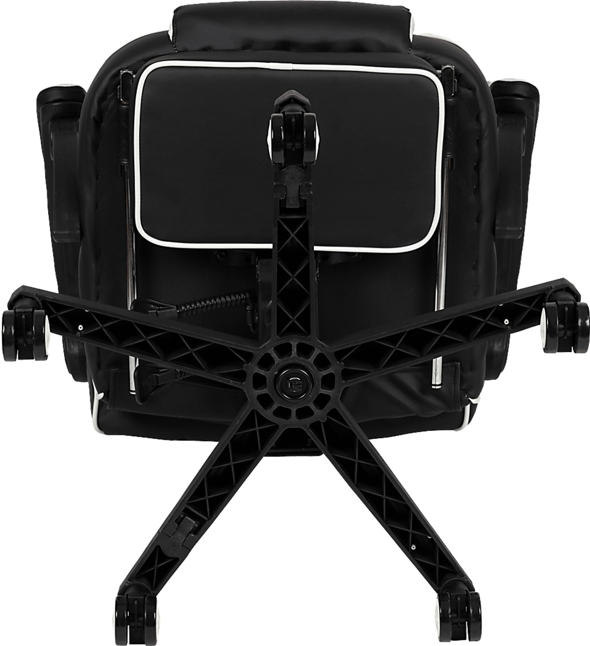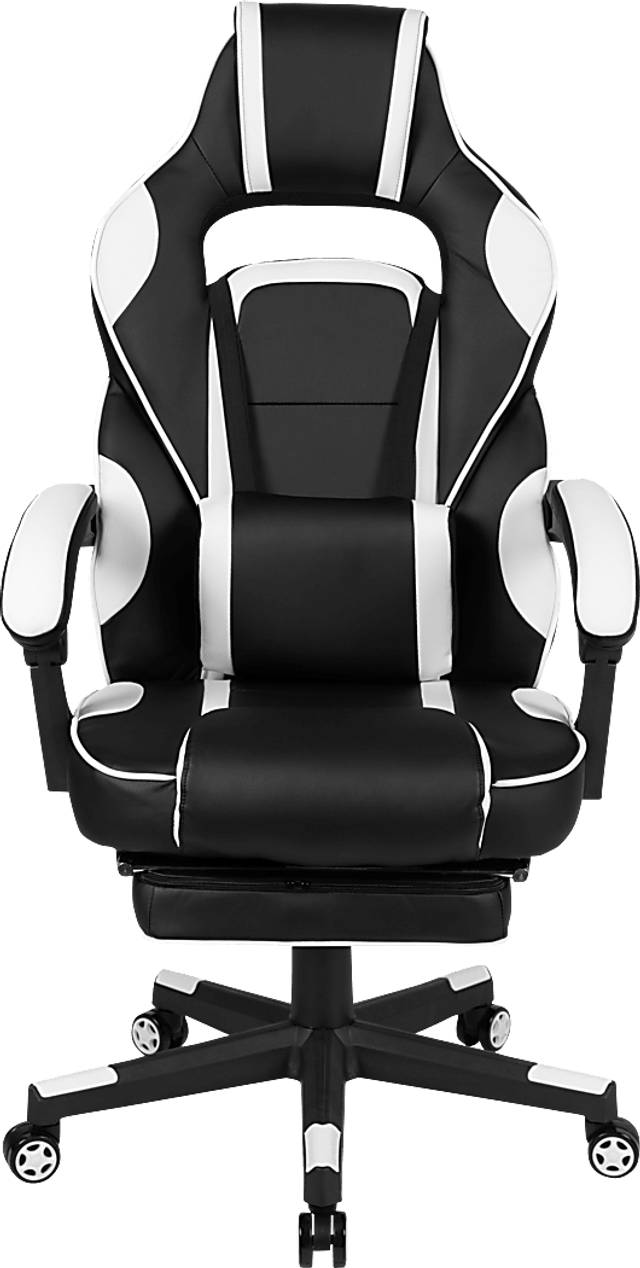 Sit back, take a deep breath and get ready to have your mind blown when you take a ride in this thickly padded, reclining gaming chair with massager. This cool looking game chair has a striking contrast of black and white upholstery to look awesome in your decor. The removable lumbar pillow will not only support your lower back, it will also massage those tense muscles when you plug in the attached 3 ft. USB cord so you can keep that marathon gaming session going without cramping up. When you need a breather from the action, recline this high back chair 95 ~ 175 and surprise! Reclining chairs cradle your body in a comfortable position while relieving pressure from your back from sitting upright. The arms actually recline along with the back to keep you comfortable. Pull the loop to slide out the footrest, flip it up and take a quick power nap to recharge your batteries. Customer assembly is required.