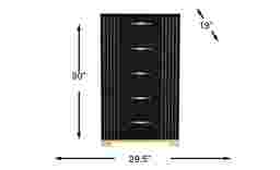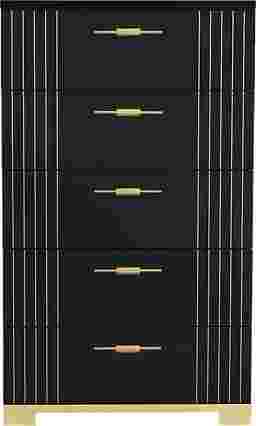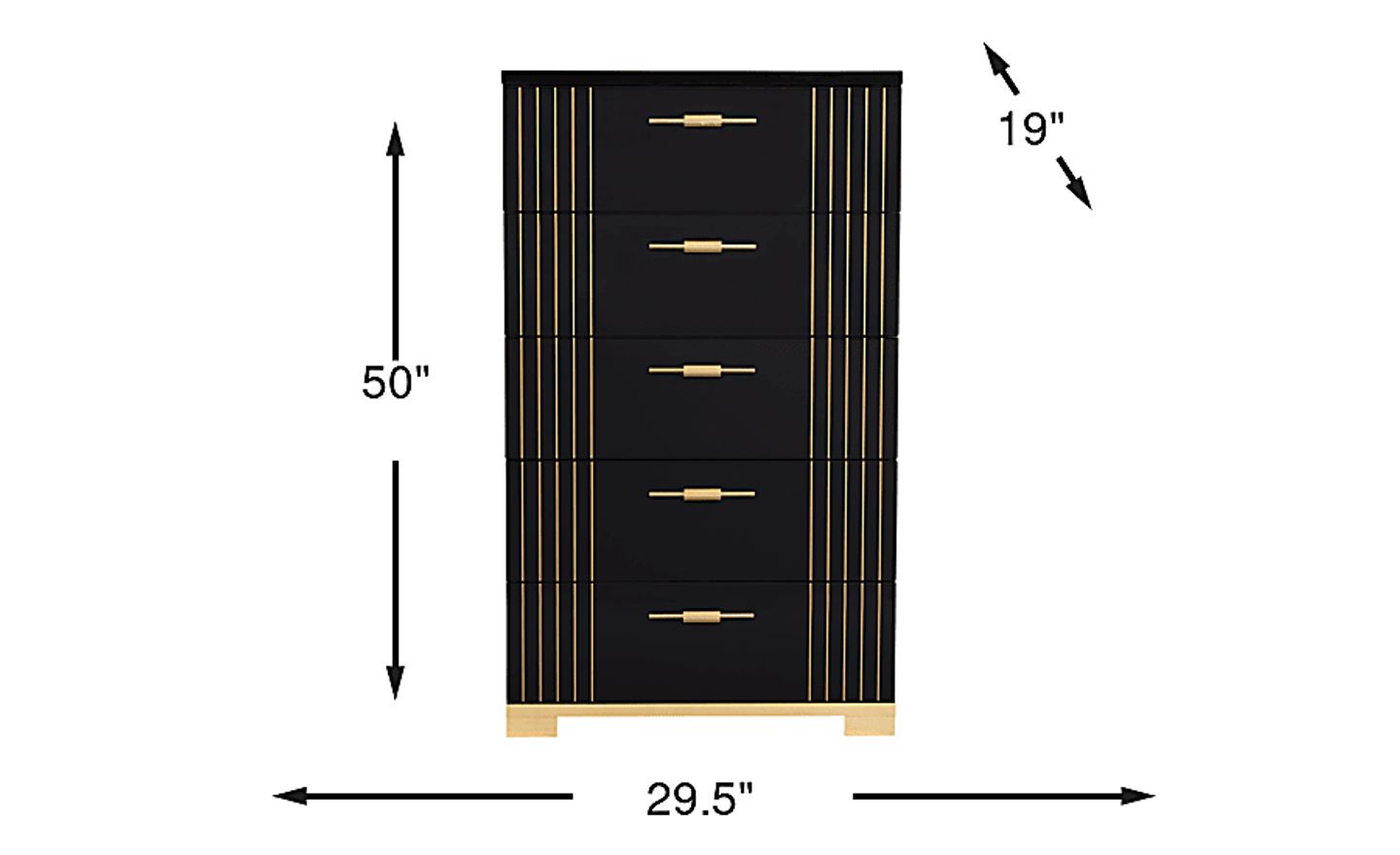 Designed to have an upscale feel with touches of old world cool, the art deco style of the Fairbanks chest delivers a suave appearance from every angle. Crafted to make a splashy statement, this piece mixes timeless style with a tailored appearance to magnificent effect. This chest's many intricacies are enhanced by its high gloss black lacquered finish. Gold pinstripe details throughout lend the piece a boisterous hint of contemporary flair while the block legs finished in a matching color give the look something of a Midas touch. The five drawers are constructed with undermounted ball bearing glides. Custom drawer pulls cast from aluminum adorn the chest with lavish final appeal.