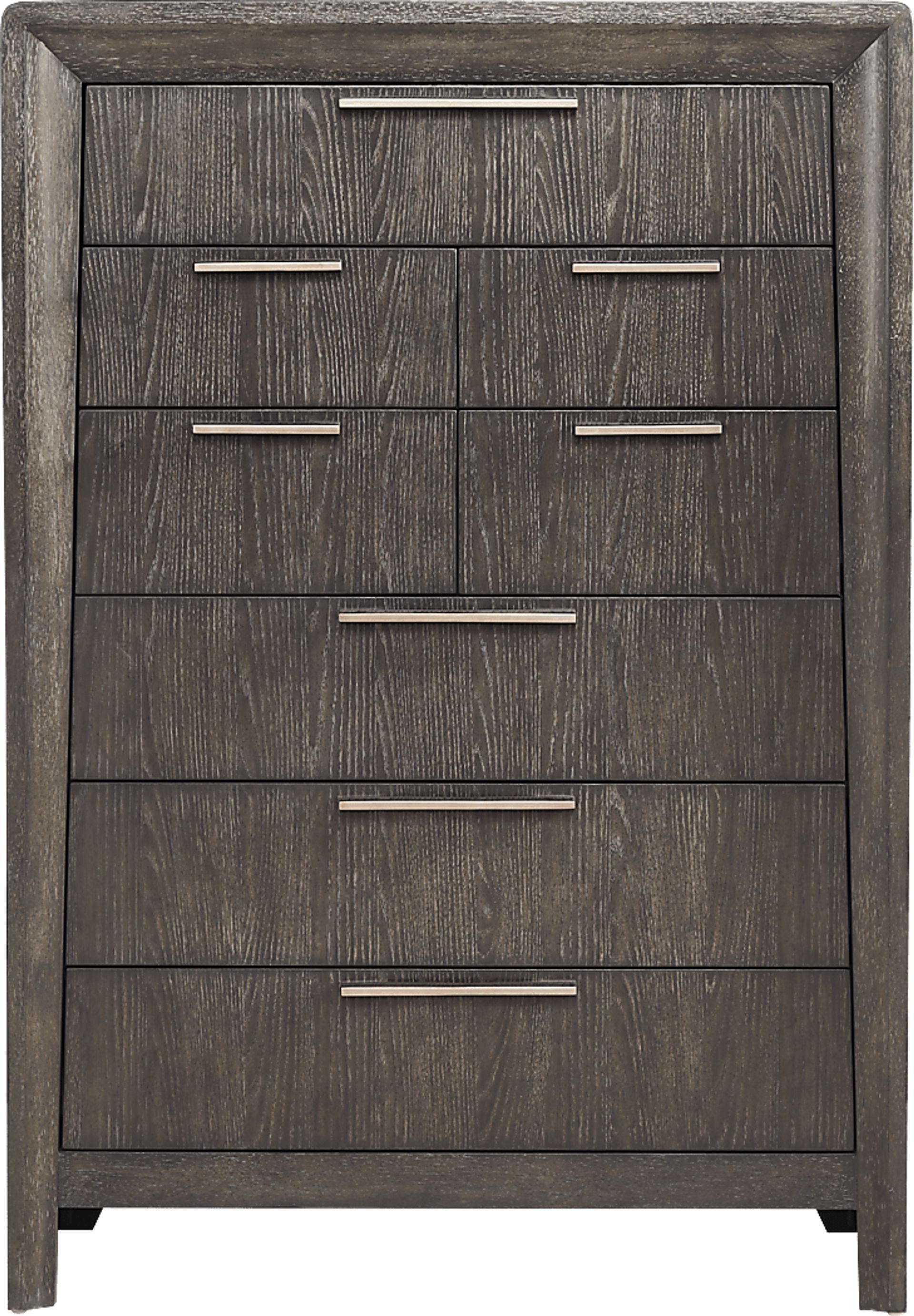 Like the first breath of fresh air on a crisp morning in the mountains, you'll never grow tired of the Fairfax chest from Cindy Crawford Home. With oak veneer surfaces in an alluring gray finish, this piece features soft shoulders, tapered posts and cove molding with metal bar hardware that adds extra industrial appeal. All eight drawers are made with front and back English dovetail joints for enhanced durability while ball bearing full extension glides offer a premium opening and shutting experience.