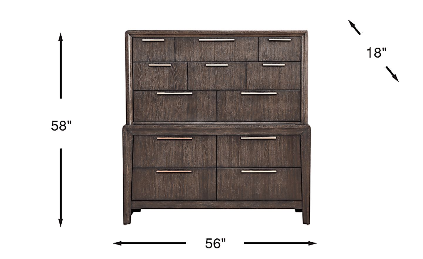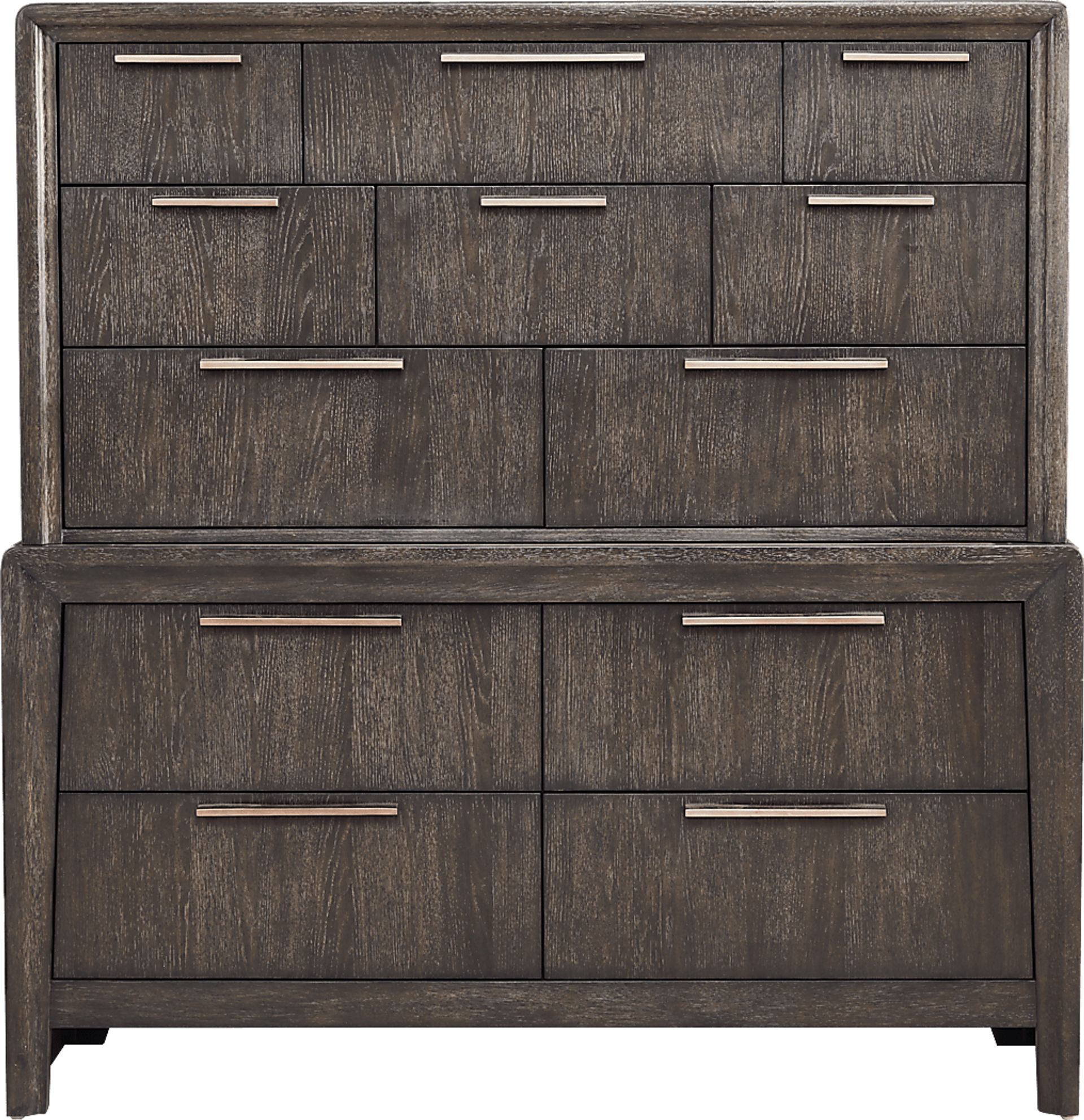Like the first breath of fresh air on a crisp morning in the mountains, you'll never grow tired of the Fairfax collection from Cindy Crawford Home. With oak veneer surfaces in an alluring gray finish, this master chest features soft shoulders, tapered posts and cove molding with metal bar hardware that adds extra industrial appeal. All twelve drawers are made with front and back English dovetail joints for enhanced durability while ball bearing full extension glides offer a premium opening and shutting experience.