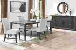 Like the first breath of fresh air on a crisp morning in the mountains, you'll never grow tired of the Fairfax side chair from Cindy Crawford Home. With oak veneer surfaces in an alluring gray finish, this piece features tapered legs, a wood top accent and an upholstered seat in gray with tufted lines across its gently curved back. Subtle welted seams across the top and base complete the look.