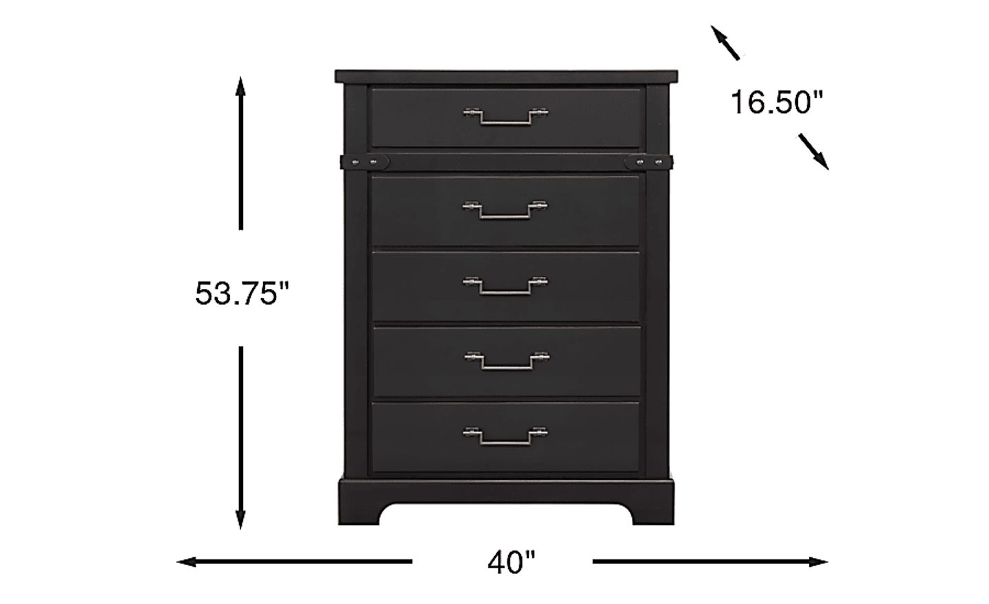 This chest features five spacious drawers designed for efficient vertical storage. It measures 40" wide, 16.5" deep, and 53.75" high, providing a substantial amount of organization space while maintaining a streamlined profile in your bedroom.